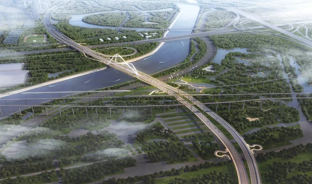 承天大道桥梁沿线串联机场跑道公园、预留白地、河头湿地公园等多个城市公园绿地和公共活动设施,运用整体景观的设计手法,将承天大道桥梁打造成一条贯通南北、串联城市各个重要功能的生态绿线,一条缝合城市空间的“生态绿线”还城市以“绿水青山”的南北轴线。创造一个立体、宜人的城市慢行空间,可以登高远望,观赏秦淮风光、充满生机的城市生态公园、摩登的城市天际线,打造尺度宜人、步行宜人、景色宜人的立体城市公园。