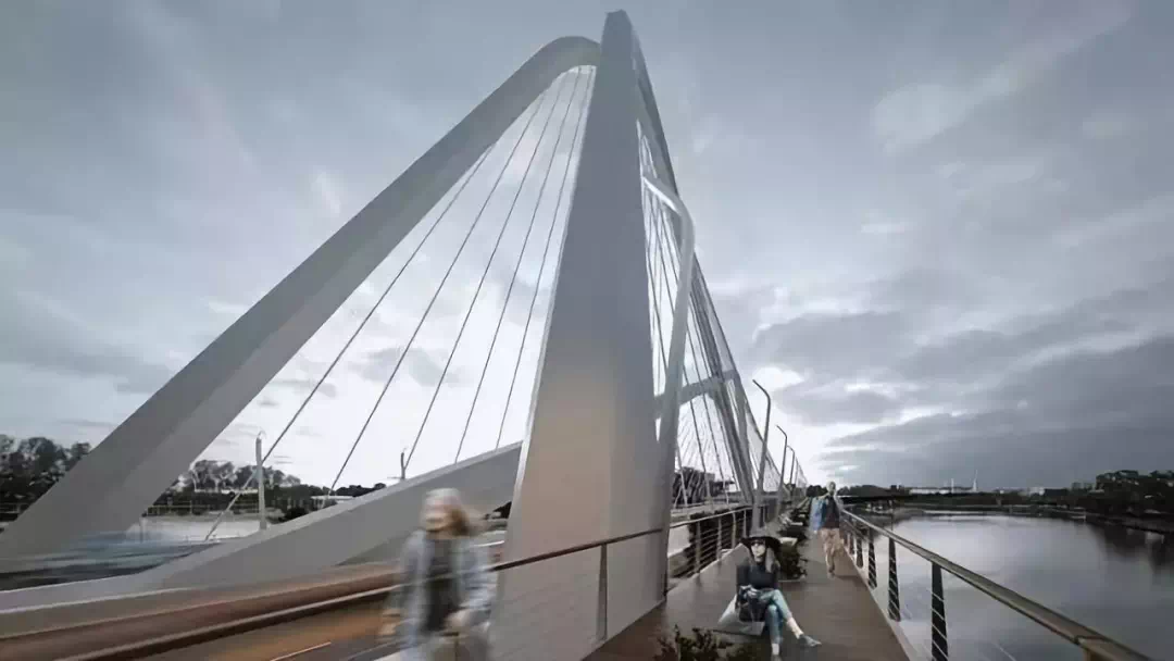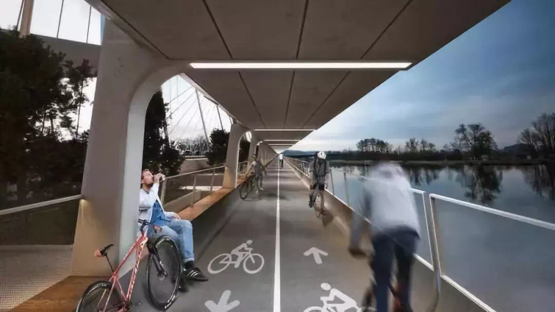 承天大道跨外秦淮河大桥创新采用双层人非结构,人行、非机动车、机动车在这里被有效地隔离开,不被相互干扰。上层通道给行人提供安全舒适的步行环境、休息座位以及全景观景台,行人能够欣赏到外秦淮河全景风景;下层通道给非机动车提供高效、安全、视野开阔的骑行环境,同时无阻碍观赏秦淮河风光。