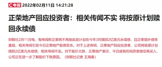 据财联社电报,对于上述传闻,正荣地产午后回应投资者,公司将按原计划赎回2亿美元永续债,相关传闻不实。对于股价大跌,正荣地产表示,今日或有机构恶意做空再买入,公司正在进一步了解股价下跌原因。