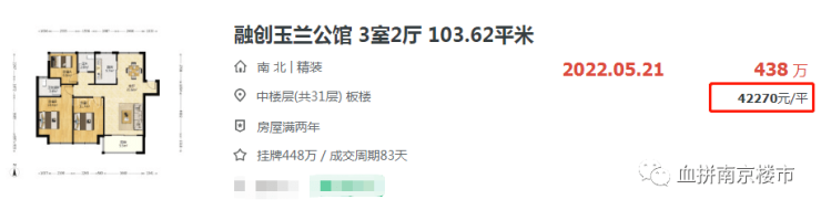 燕子矶目前二手房的头牌融创玉兰公馆较新成交价在4.2万/平。