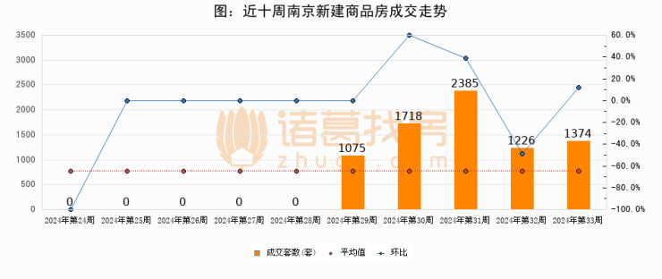 进入2024年第33周(08月12日-08月18日),南京新建商品房成交1374套,较上周增加148套,环比上涨12.1%。从近十周成交来看,周均成交套数为777套,本周成交1374套,高于近十周平均成交量76.8%。