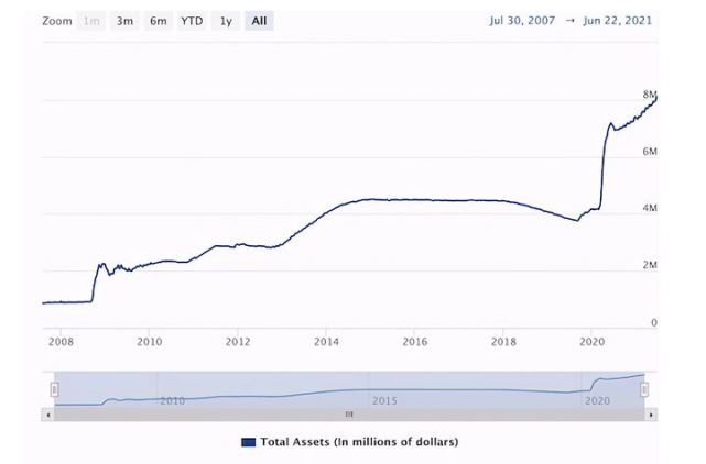 年6月,美联储的资产负债表规模突破8万亿美元,2008年启动QE(量化宽松)前才区区0.87万亿美元,住房抵押贷款支持证券(MBS)占资产负债表总规模的29.06%。