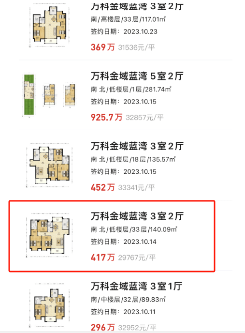 万科金域蓝湾甚至已经出现2字头的成交价了,一套10月份成交的140平户型,总价417万,折合单价29767元/平,当年也是很火的神盘啊。
