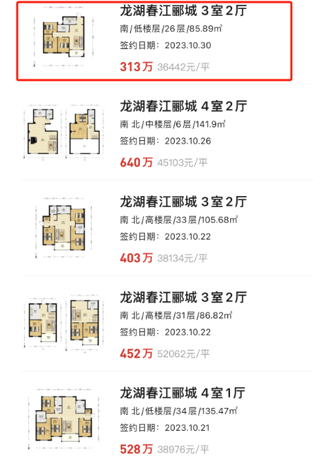 龙湖春江郦城也只有复式的房源还能撑住,其他户型的成交单价也都跌到了3万多,最近一套85㎡房源只卖了36442元/平,还记得之前收官的时候,新房还卖3万5呢。