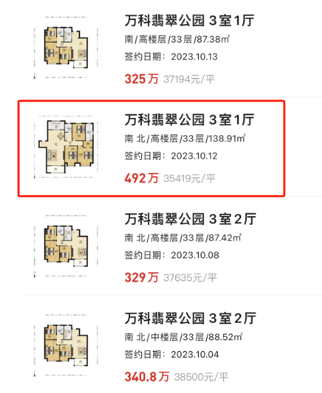 万科翡翠公园近期的成交价也都在3万多,上个月一套138㎡的房源成交价仅有3.5万+,也是相当低的存在了。