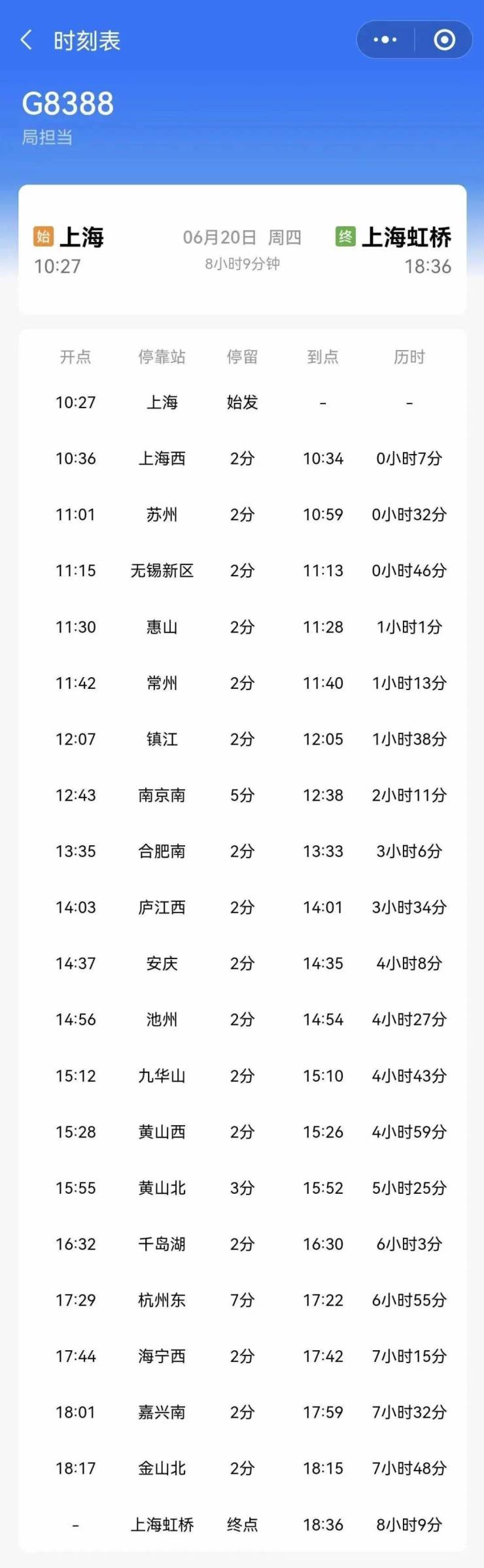 该车次沿途停靠上海站、上海西站、苏州站、无锡新区站、惠山站、常州站、镇江站、南京南站、合肥南站、庐江西站、安庆站、池州站、九华山站、黄山西站、黄山北站、千岛湖站、杭州东站、海宁西站、嘉兴南站、金山北站、上海虹桥站。