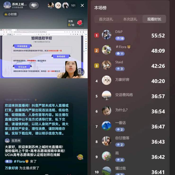 同样在6月25日,新东方UCIA高考志愿填报认证规划师江老师走进苏州美的置业上城时光抖音直播间,为学生和家长解读江苏高考新政策,回答家长的“一揽子”提问,直播间最高在线人数突破150人,在直播间蹲守了近50分钟的美的上城时光业主马先生表示:“孩子高考考得不错,但报志愿我们家长是真的帮不上忙,听了老师讲的几个选学校的参考纬度,感觉清晰了很多,老师讲的太好了,全是干货。”
