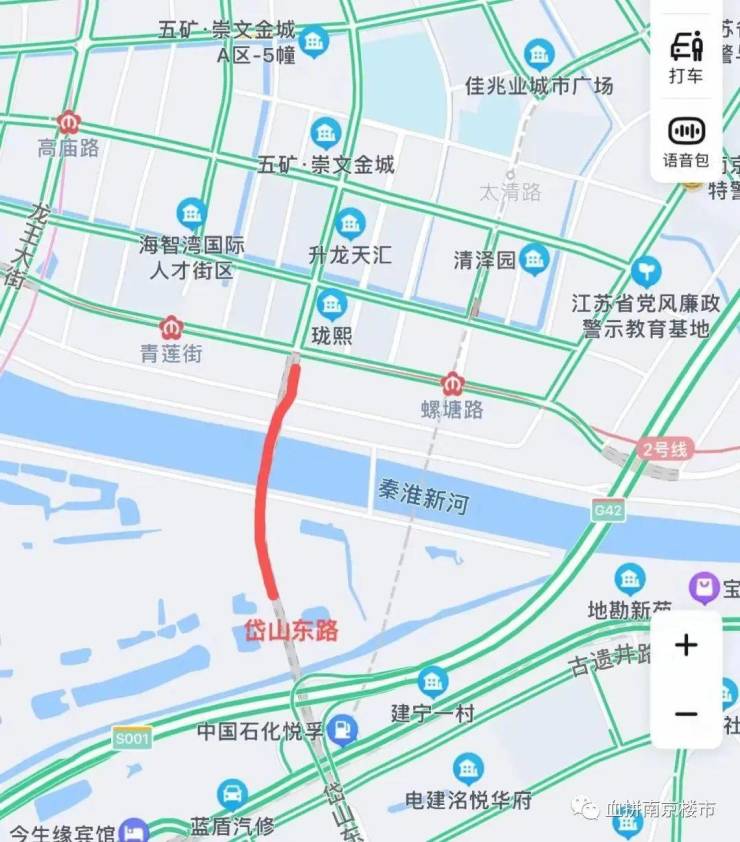 岱山东路立交距离河西直线距离仅1000多米,在上跨宁芜铁路、宁芜公路后暂时断头,车辆只能通过匝道右转前往绕城公路、宁芜公路。而在断头处位置向北,秦淮新河中正在架设一座桥梁,这便是北延工程。