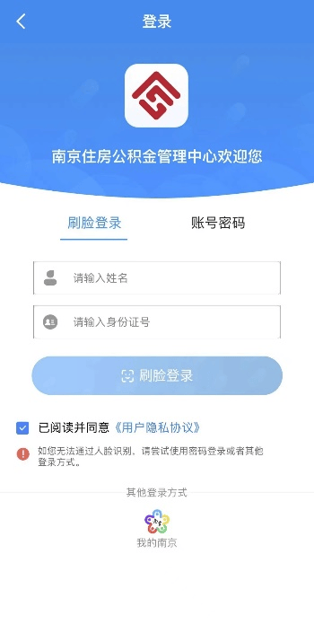 首次登陆南京公积金App可以输入本人姓名和身份证号码进行刷脸登录。