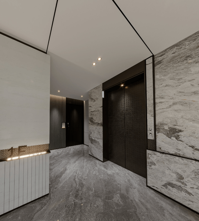 设计上同样参照五星级酒店式入户门厅,融合瓷砖、定制入户门牌、装甲门、暖色灯光,营造精致归家的仪式感。