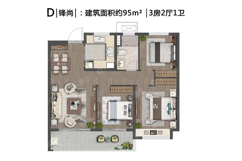 1、建筑面积约95㎡户型做到了三房,未来好出手