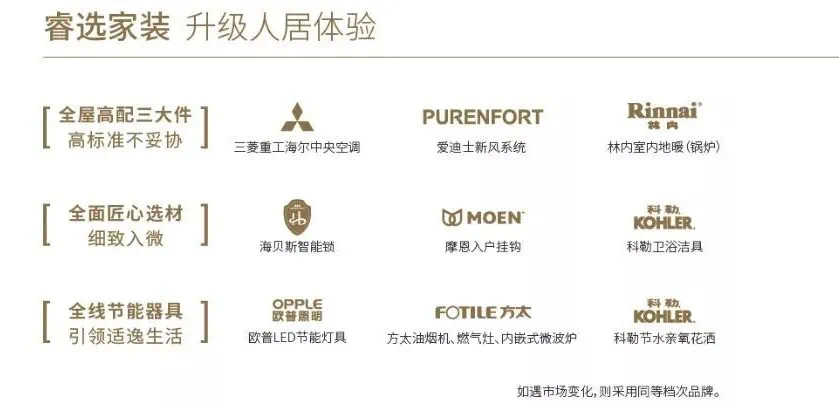 据悉,世茂璀璨睿湾采用了科勒、三菱重工海尔、爱迪士、方太、摩恩、欧普等品牌装修,三大件地暖、中央空调、新风系统齐全;此外,还有警报系统、隔热隔音中空玻璃、电子门锁等。
