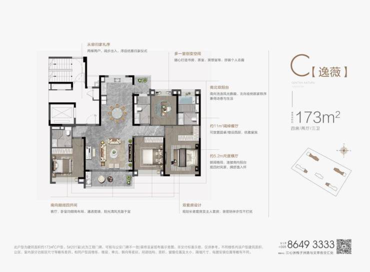 C户型 173㎡:南向四开间,双套房设计,南北双阳台,功能性、实用性满分