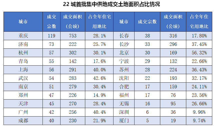据贝壳研究院统计,22城首批集中供地中,有9个城市的宅地成交面积占今年全年住宅供地比例超过30%。其中上海和武汉占比均超过40%;北京占比较高,达56.32%。