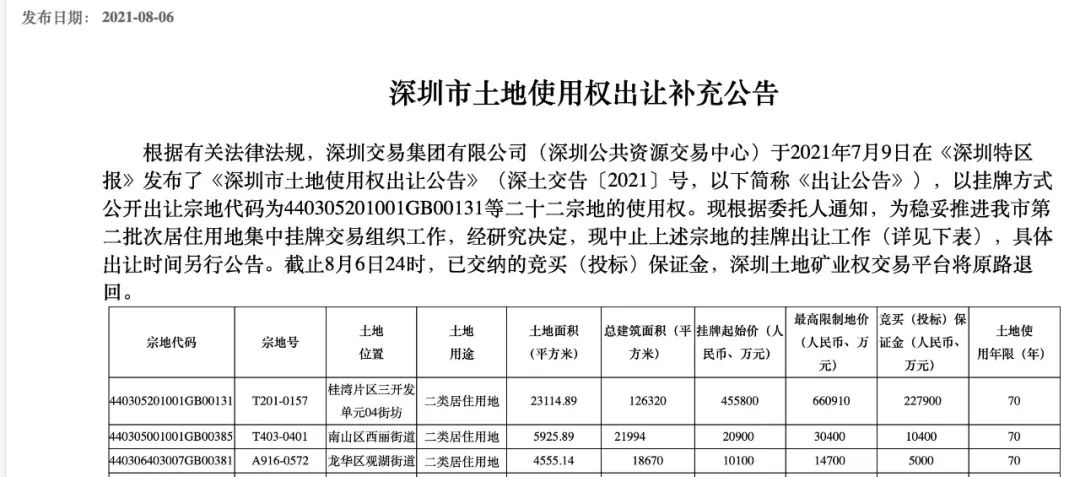 在第二批集中土拍开始的前一个工作日深夜,深圳紧急发布“中止”公告。此后,宣布第二批集中土拍中止或延期的城市越来越多。