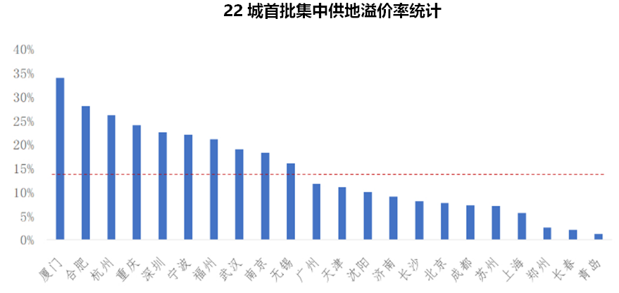 在22城首批集中供地中,包括厦门、合肥在内的10个城市的平均溢价率超过15%。在地产行业资深人士毛呈飞看来,“首批集中土拍的规则没有抑制溢价率,反而进一步压缩了房企的利润。”