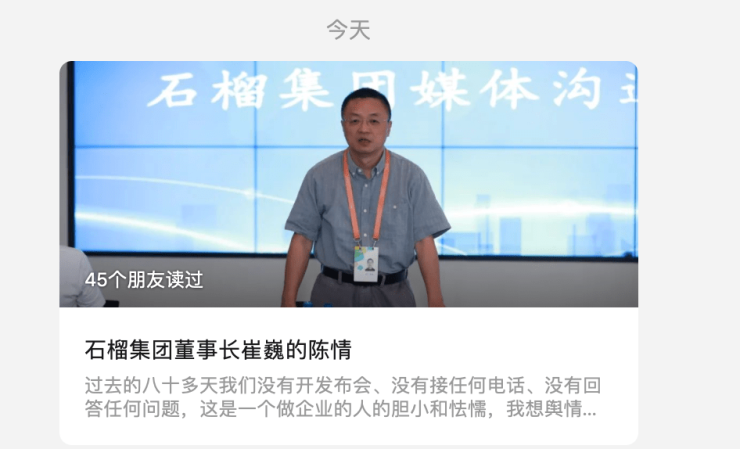 “今天这个场合与大家见面,作为石榴集团的董事长和法人,我现在的心情是既抱歉又丢脸。我在这里先给大家道个歉。最近冠以石榴集团的各种新闻已经铺天盖地,占据了大量的公共舆论资源,刷低了各种社会伦理底线。作为石榴集团的当家人,扪心有愧,惶恐不安。”