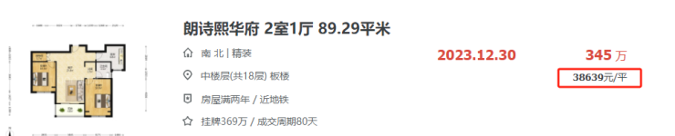朗诗熙华府89平的两房成交总价仅345万元,折合单价约3.88万元/㎡。