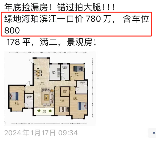 绿地海珀滨江一套178㎡房源,一口价780万,含车位800万。车位只卖20万也就算了,780万178平,折算下来房价只有4.38万/㎡。要知道海珀滨江是现在公认的河西南品质较高的次新房之一,今年也是成交不断,成交价也不低,甚至被称为鱼背头牌好房,却也逃不过砸盘的命运。