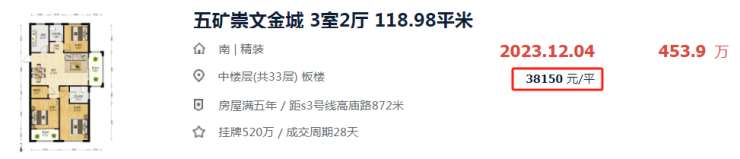 五矿崇文金城一套约119㎡的三房,3.8万/㎡成交。