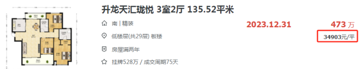 升龙天汇一期珑悦一套建面约135.52㎡的大三房,总价473万成交,单价仅34903元/㎡。