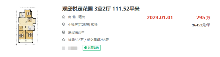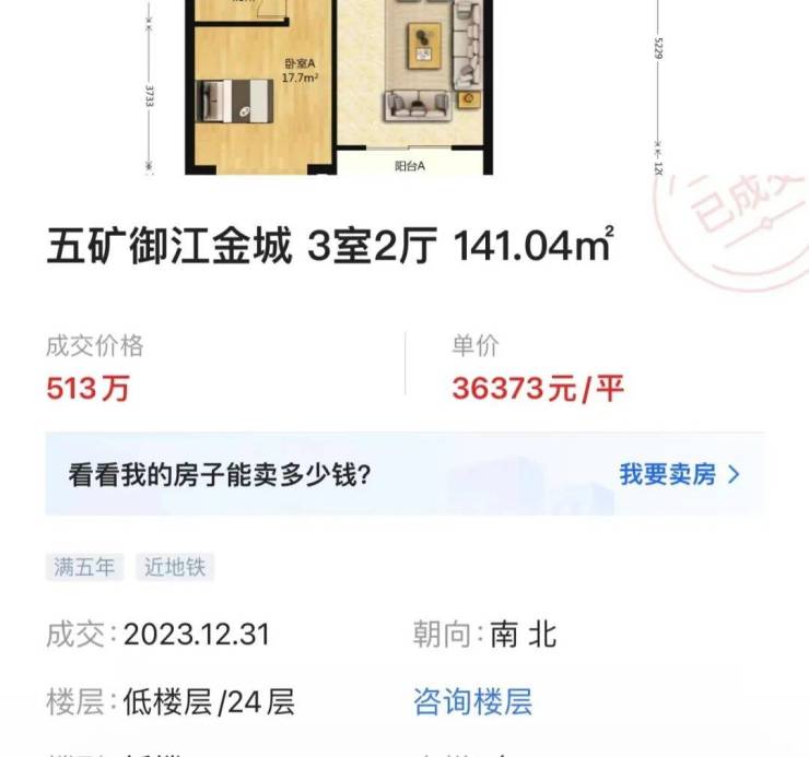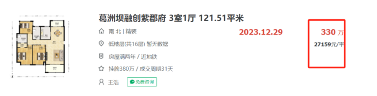 上秦淮葛洲坝融创紫郡府121㎡房源330万卖出,单价仅为2.7万/㎡,当年新房均价3.1万/㎡;