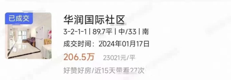 1月17日,华润国际社区以单价2.3万元/㎡的价格成交了一套89㎡的中楼层,总价仅206.5万元。