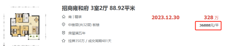 招商雍和府88平三房,3.69万/㎡成交。