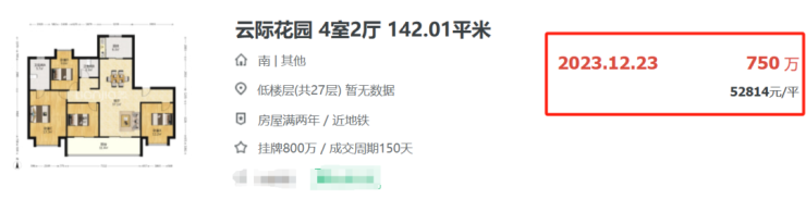 河西中云际花园卖出首套二手房,142㎡四房,成交价750万,折合单价52814元/㎡;