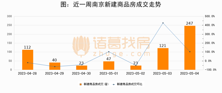 根据南京市住房保障和房产局数据显示,2023年05月04日南京新建商品房成交247套,较昨日增加126套,环比上涨104.1%