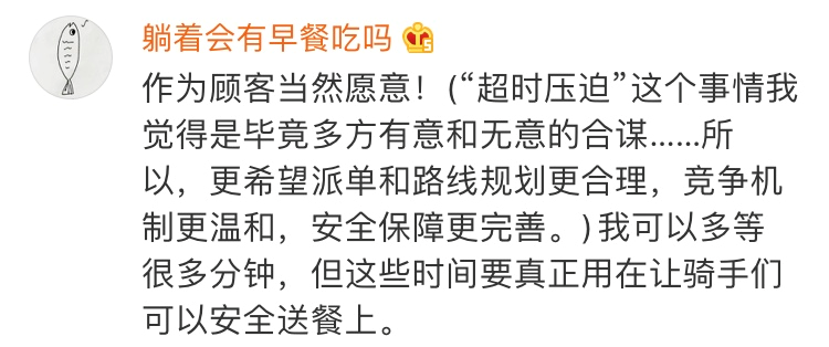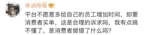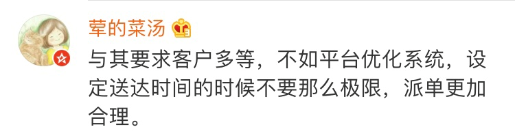 还有的网友表示,平台要做系统优化放宽骑手送达的时间要求,建议企业加强对骑手的薪资和福利保障。