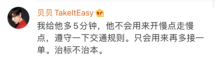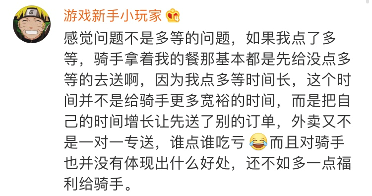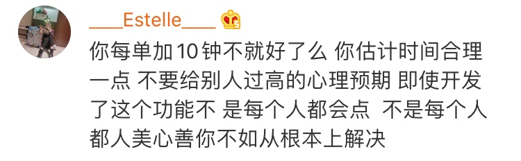 外卖送达时间也是系统出的,现在叫用户去多等,自己出来卖情怀,搞得好像是用户催着外卖员去赶时间的一样。”对饿了么宣布即将新增的功能,有用户如是说。