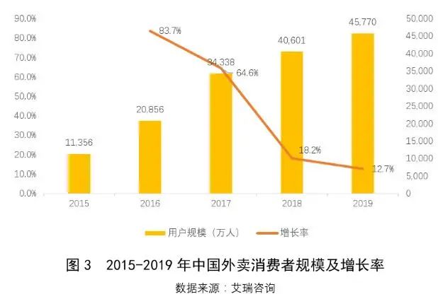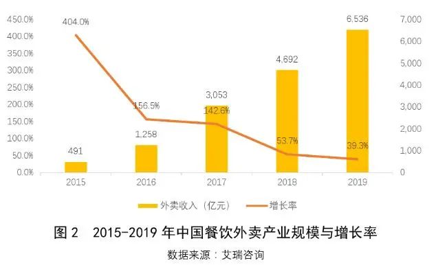 艾瑞咨询数据显示,截至2019年年底,我国餐饮外卖产业规模为6536亿元,同比增长39.3%;我国外卖消费者规模约4.6亿人,同比增长12.7%,在9亿网民中的占比约为50.7%。