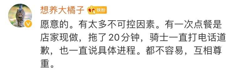 有网友表示这是人性化的改进,外面配送过程有太多不可控因素,都不容易,互相尊重,愿意等待;