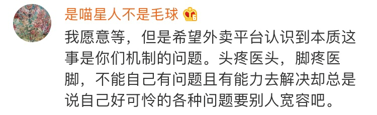 也有网友质疑是将责任转嫁给消费者,是“甩锅”行为,这是将公司和骑手之间的矛盾转移到用户和骑手之间,这种手段治标不治本;