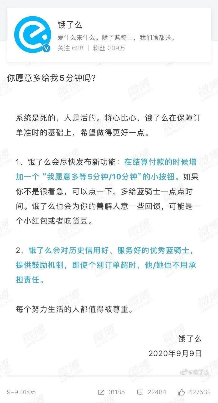 9日凌晨,饿了么率先发声,一篇《你愿意多给我5分钟吗?》的声明。饿了么在声明中表示,将尽快推出一项新功能——“我愿意多等5分钟/10分钟”按钮。