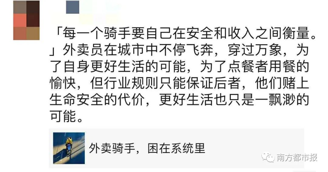 文章还指出,在系统的压迫下,外卖骑手受到派送时间不合理、规划路线含逆行、商家出餐慢、超时高额罚款等问题的多重折磨,为了不被系统除名、不影响站点数据,骑手们不得不选择铤而走险,每天都在违反交规、与死神赛跑,外卖员成了高危职业。有外卖骑手如此形容自己的职业:“送外卖就是与死神赛跑,和交警较劲,和红灯做朋友。”