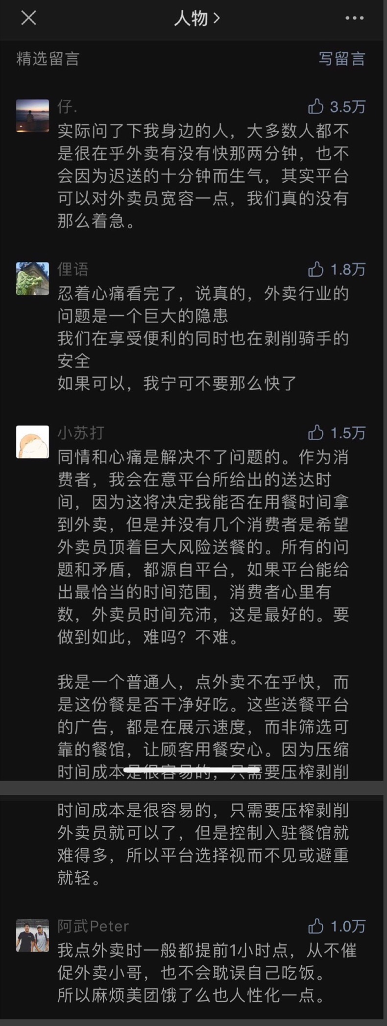 该文评论区中点赞量前4的评论,均大致上表达了同一层意思:自己愿意给骑手多一点时间上的宽容,希望平台也可以这么做。