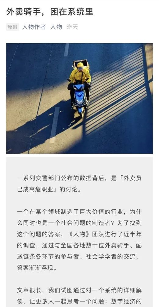 9月8日,《人物》刊发报道《外卖骑手,困在系统里》。报道反映了外卖平台算法系统和骑手实际工作的大量冲突,直接导致外卖员遭遇交通事故的数量急剧上升,使得外卖骑手已经成为最危险的职业之一,引发全网关注。