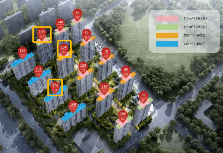 项目拟建15栋17F-25F小高层及高层住宅,户型建面约110㎡、118㎡、128㎡、142㎡,涵盖刚需、改善不同需求。共计1340户的中型社区,自带少量沿街商业,未来能满足基本的生活需求。