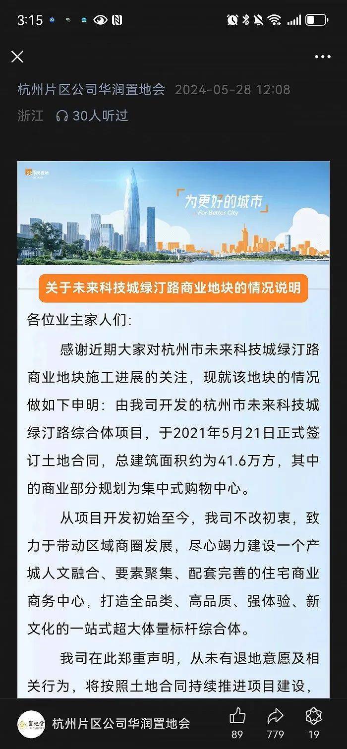 5月28日,华润置地通过微信公号“杭州片区公司华润置地会”公开回应其杭州市未来科技城绿汀路商业地块“退地”传闻,称“从未有退地意愿及相关行为,将按照土地合同持续推进项目建设,直至项目商业顺利开业”。