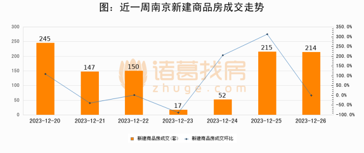 根据南京市住房保障和房产局数据显示,2023年12月26日南京新建商品房成交214套,较昨日减少1套,环比下降0.5%