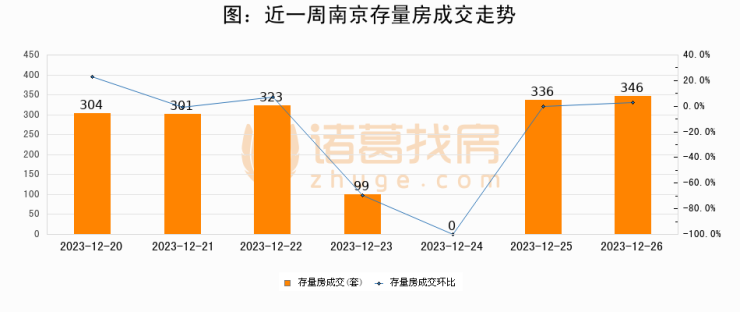 从存量房来看,2023年12月26日南京存量房单日成交346套,比昨日增加10套,环比上涨3%。从近一周存量房成交来看,南京存量房日均成交套数为244套,12月26日单日成交346套,高于近一周平均水平41.8%。