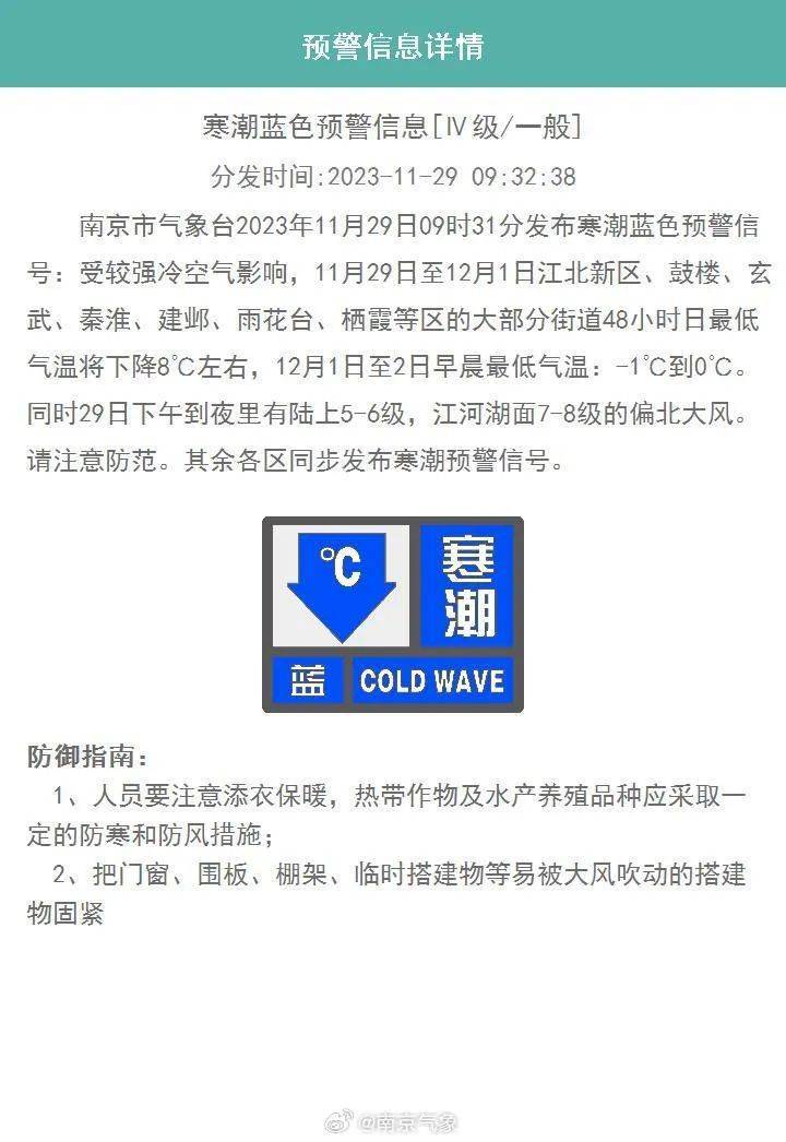 南京市气象台发布寒潮蓝色预警信号受较强冷空气影响,11月29日至12月1日江北新区、鼓楼、玄武、秦淮、建邺、雨花台、栖霞等区的大部分街道48小时日最低气温将下降8℃左右,12月1日至2日早晨最低气温:-1℃到…
