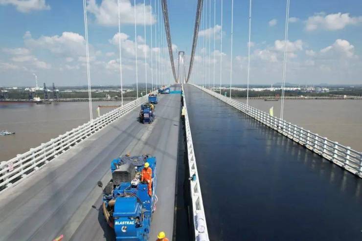 10月11日,仙新路过江通道主桥钢桥面铺装重要工序喷砂除锈及防水粘结层施工顺利完成。