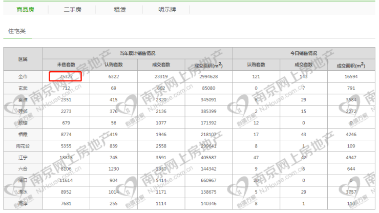 但目前南京新房库存仍在7.5万套的高位,而去年同期是6万套库存。