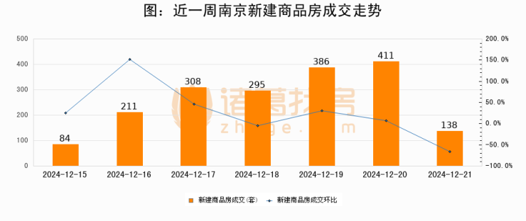 根据南京市住房保障和房产局数据显示,2024年12月21日南京新建商品房成交138套,较昨日减少273套,环比下降66.4%