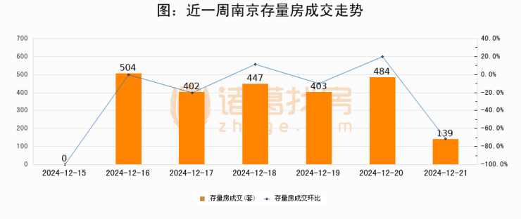 从存量房来看,2024年12月21日南京存量房单日成交139套,比昨日减少345套,环比下降71.3%。从近一周存量房成交来看,南京存量房日均成交套数为339套,12月21日单日成交139套,低于近一周平均水平59%。