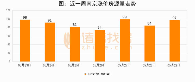 根据诸葛找房数据显示,南京24小时涨价房源量为97套,较05月28日增加13套,环比上涨15.5%。与此同时,涨价房源占比小幅扩大,业主信心有所提升。
