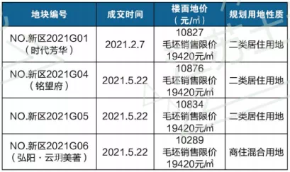 值得一提的是,在排名前列批次集中出让中,紧邻两幅地块的NO.新区2021G07、G08、G09均触顶较高限价,较高毛坯销售限价30755元/㎡。
